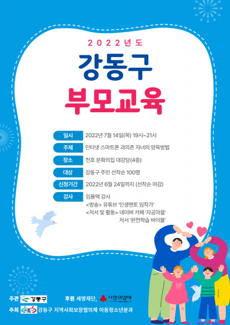 지난 6월 20일(월), 강동구(구청장 이정훈) 청소년상담복지센터(센터장 최은영)가 다가오는 7월 14일(목) 부모 교육을 진행한다고 밝혔다. 이번 부모 교육은 강동구청 주관, 강동구 지역사회보장 협의체 아동·청소년분과의 주최로 진행되며 세영재단과 사랑의 열매가 후원한다.