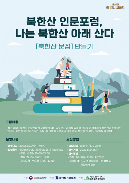 지난 5월 29일(일), ‘책을 품은, 열린 지식·문화공간’ 구립 은뜨락도서관(관장 김명수)은 문화체육관광부에서 주최하고 한국도서관협회가 주관한 이번 2022년 '길 위의 인문학' 공모사업으로 선정되어 ‘북한산 인문 포럼: 나는 북한산 아래 산다’ 프로그램을 운영한다고 밝혔다.