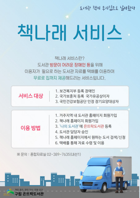 지난 5월 29일(일), 책을 품은, 열린 지식·문화공간’ 구립 은뜨락도서관(관장 김명수)은 국가 상호대차 서비스, 장애인을 위한 도서 택배 대출 ‘책나래’를 지속해서 운영한다고 밝혔다. 본 책나래 서비스란 도서관 방문 이용이 어려운 장애인을 대상으로 우체국 택배를 이용해 도서 등 도서관 자료를 집까지 무료 배달 및 수거해주는 서비스이다.