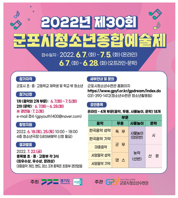 군포시청소년수련관(군포시청소년재단)은 다가오는 6월 7일(화)부터 7월 5일(화)까지 군포시 관내 초·중·고등학교에 재학생 및 해당 연령 청소년을 대상으로 ‘2022년 군포시청소년종합예술제(예선)’을 진행한다고 밝혔다. 이번 예술제는 음악, 무용, 사물놀이, 문학 등 4개 부문 18개 종목으로 진행되며 청소년들에게 꿈과 희망을 심어줌과 동시에 예술 활동의 공간을 마련함으로써 청소년들의 예술적 재능을 마음껏 발휘할 수 있는 장으로 활용될 예정이다.