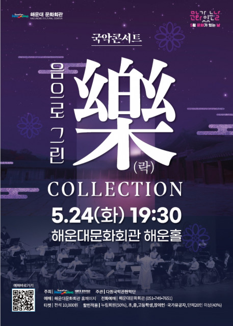 다가오는 5월 24일(화), 해운대문화회관(관장 서영지)이 해운대문화회관 해운홀에서 5월 문화가 있는 날 국악콘서트 ‘음으로 그린 樂’ 무대를 선보인다. 이번 콘서트는 문화체육관광부가 주최하고 한국문화예술회관연합회와 해운대문화회관이 주관하는 행사로 문화가 있는 날의 하나로서 관객들과 함께 봄을 그려낸다.