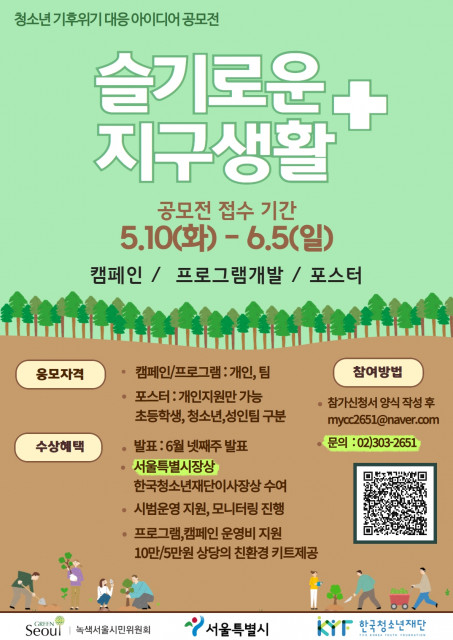 한국청소년재단(이사장 황인국)은 청소년 기후위기 대응 아이디어 공모전 '슬기로운 지구생활+'를 6월 5일 환경의 날까지 진행한다. 이번 공모전은 UN이 발표한 SDGs 목표에 맞춰 지역 내 새로운 청소년 기후위기 대응 활동을 발굴하고 지원하기 위해 서울시와 녹색서울시민회 후원을 통해 진행된다.