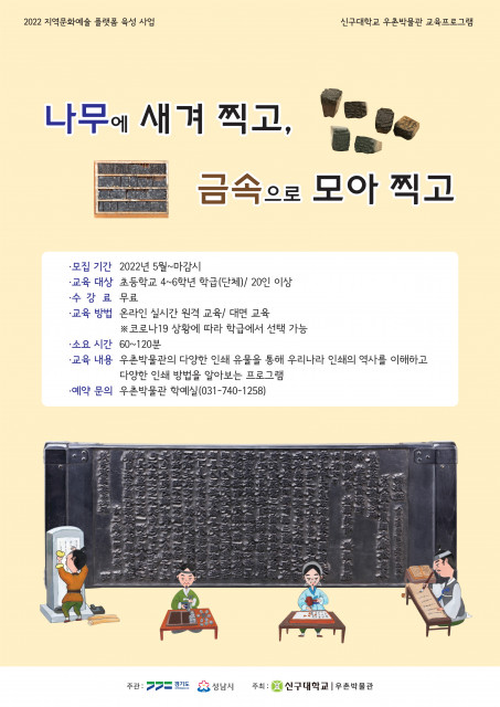 지난 5월 26일(목), 신구대학교 우촌박물관(관장 한경식)은 2022년 지역문화예술 플랫폼 육성 사업의 하나로서 무료 교육 프로그램 운영에 나선다고 밝혔다. ‘나무에 새겨 찍고, 금속으로 모아 찍고’ 프로그램은 초등학교 4학년부터 6학년까지 고학년 단체(20인 이상)를 대상으로 진행된다.