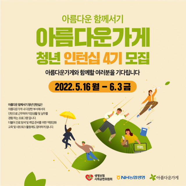 나눔과 순환을 실천하는 공익법인 아름다운가게(이사장 홍명희)가 5월 16일(월)부터 6월 3일(금)까지 자립준비청년(보호종료아동) 대상의 ‘아름다운 함께서기 : 청년 인턴십 4기’를 모집한다고 밝혔다. 본 인턴십은 해당 청소년의 자립역량을 강화하고 자립기반 형성을 통한 안정적 사회 적응을 돕기 위한 프로그램으로, 아름다운가게 내의 다양한 부서에서 직접 실무를 경험하며 진로 탐색과 함께 취업역량 강화 등을 위한 교육 프로그램 등을 지원받게 된다.