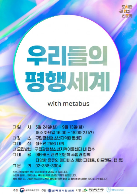 구립은평뉴타운도서관(관장 박종범)은 문화체육관광부가 주최하고 한국도서관협회가 주관하는 ‘2022년 도서관 길 위의 인문학' 공모사업 수행기관에 선정돼 ‘우리들의 평행세계’를 운영한다고 밝혔다. 이번 '길 위의 인문학'은 각 지역의 도서관을 거점으로 지역주문에게 지역의 역사 및 문화, 예술 등 다양한 콘텐츠를 활용해 인문학 강의와 탐방을 진행하는 사업으로 인문학의 대중화와 독서문화 활성화를 목표로 한다.