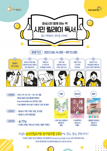 화성시 도서관이 시민 대상의 책 함께 읽기 운동 '시민 릴레이 독서'를 운영하기 위해 릴레이를 시작할 77개의 참가팀을 지난 5월 15일부터 6월 6일까지 선착순으로 모집한다. 릴레이 독서는 한 팀이 한 권의 책을 릴레이로 읽는 독서 운동으로 아동, 청소년, 일반 분야로 나뉜다.