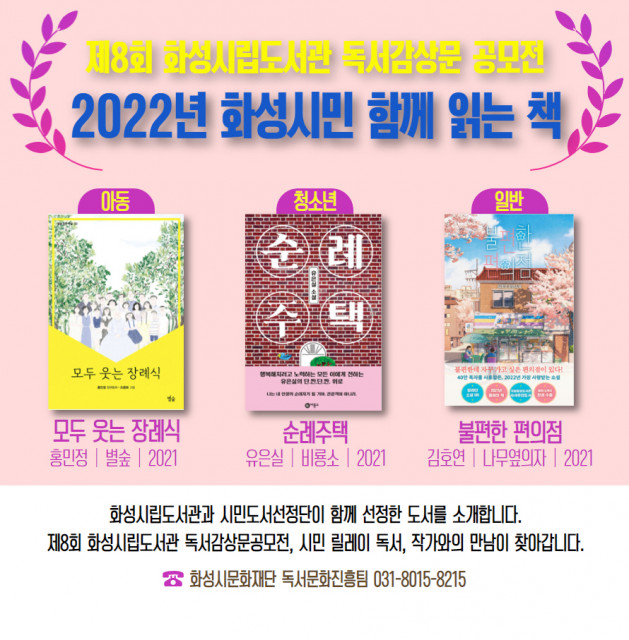 지난 5월 4일(수), 화성시 도서관은 4월 29일 제8회 독서감상문공모전 ‘시민도서선정단’ 위촉식을 진행하고, 공모전 대상 도서 3권을 최종 선정했다고 밝혔다. 이번 공모전 대상 도서는 시민이 직접 내 가족과 이웃이 함께 읽으면 좋을 책을 선정할 수 있도록 공개 모집으로 진행하였으며, 이날 진행된 시민도서선정단 위촉식에서 학생·도서관 이용자·교사 등 다양한 시민으로 이뤄진 총 8명의 단원에게 위촉장을 수여했다.