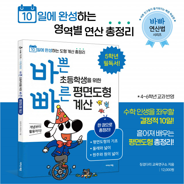 지난 5월 11일(수), 이지스에듀가 '바쁜 초등학생을 위한 빠른 평면도형 계산(이하 바빠 평면도형 계산)'을 출간했다고 밝혔다. 이 책은 초등 수학의 평면도형 계산을 한 권으로 완성할 수 있는 책으로 3학년 때 배우는 ‘평면도형의 기초’부터 4학년의 ‘삼각형, 사각형, 다각형’, 5학년의 ‘다각형의 둘레와 넓이’, 6학년의 ‘원의 둘레와 넓이’까지 조각조각 흩어진 초등 수학의 평면도형 내용을 한 권에 담았다.