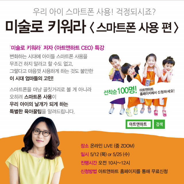 지난 5월 3일(화), 아동 심리 미술 교육 브랜드 아트앤하트가 다가오는 5월 12일, 25일 총 2회에 거쳐 아이의 스마트폰 사용으로 인해 고민이 많은 학부모를 위한 무료 특강을 진행한다고 밝혔다. 이번 특강은 온라인 실시간 세미나 방식으로 진행되며, 미술육아 베스트셀러인 ‘미술로 키워라’ 저자이자 아트앤하트 CEO인 이동영 대표가 진행을 맡았다.