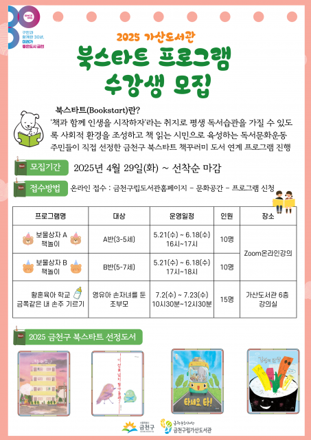 금천문화재단(대표이사 서영철) 금천구립가산도서관은 다가오는 5월 21일(수)부터 영유아 및 조부모 대상의 '2025 북스타트 프로그램'을 운영한다고 전했다. 이번 '북스타트' 사업이란 '책과 함께 인생을 시작하자'라는 취지를 바탕으로 '영유아'가 평생의 독서습관을 가질 수 있도록 사회적 환경을 조성할 뿐더러 책 읽는 시민으로 육성하기 위한 독서문화운동이다. 올해의 경우 자녀 양육을 조부모에게 의존하는 맞벌이 가구가 많아지고 있는 상황을 고려해 조부모 대상으로 한 자녀 양육과 육아 지원 교육도 신설했다.