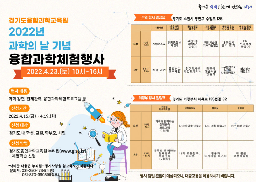 4월 23일(토), 경기도융합과학교육원(원장 이태헌)은 제55회 과학의 날 기념 학생 및 학부모 등 도민을 대상으로 '융합과학체험행사'를 진행한다. 교육원은 학생 및 교원, 학부모 도민이 다양한 융합과학 체험을 통해 미래교육 문화를 확산하고자 이번 행사를 마련했다.