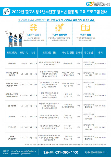 군포시청소년재단 군포시청소년수련관이 다양한 청소년활동 프로그램에 참가할 청소년 모집에 나선다. 우선, 관래 청소년을 대상으로 하는 다양한 프로젝트 사업들이 눈길을 사로잡는다. 청소년 주도 활동을 활성화하고, 청소년의 참여를 보장하기 위해 ‘GYC 오픈 심포지엄(과학편)’, ‘청청 재능마켓’, ‘상상실현 프로젝트’를 실행한다.