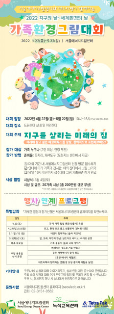 서울에너지드림센터(센터장 육경숙)가 '2022 가족환경그림대회'를 개최한다. 본 대회는 다가오는 4월 22일(금)부터 5월 22일(일)까지 지구의 날(4월 22일)과 세계환경의 날(6월 5일)을 기념하여 열린다. 이번 행사는 서울에너지드림센터와 수년간 파트너십을 유지한 글로벌 식품 전처리 및 포장 전문 기업 테트라팩 코리아가 파트너사로 함께하며, 올해로 건립 10주년을 맞은 서울에너지드림센터는 기존에 어린이들만을 대상으로 진행해오던 그림 대회를 가족 대상으로 확장했다.