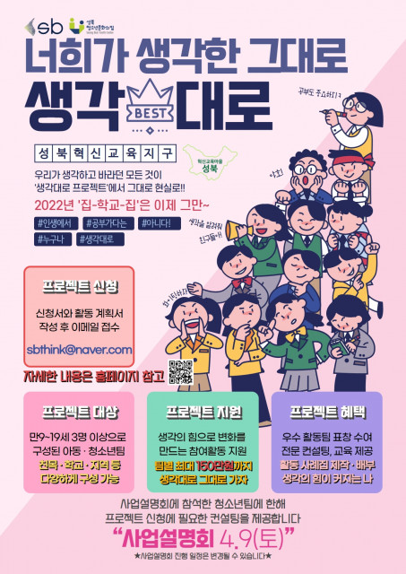 지난 3월 31일(목), 성북청소년문화의집(관장 박종국)이 2022년도 성북 서울형 혁신교육 사업의 하나로 '생각대로 프로젝트(청소년동아리 지원사업)'을 지원한다고 밝혔다. 이번 프로젝트는 성북 서울형혁신교육지구가 올해 신규 사업으로 공모했으며, 운영 단체(기관)는 성북청소년문화의집이 선정됐다.