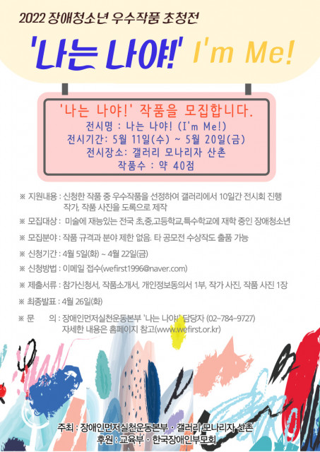 4월 1일(금), 장애인먼저실천운동본부가 갤러리 모나리자 산촌과 함께 2022년 장애청소년 우수작품 초청전 ‘나는 나야!(I’m Me!)’를 개최한다고 밝혔다. 이번 행사는 교육부와 한국장애인부모회의 후원으로 진행된다. 이번 전시는 장애 청소년에게 갤러리 전시 기회를 제공함으로써 예비 미술가로서의 경력을 더해주기 위해 개최되었으며 5월 11일(수)부터 5월 20일(금)까지 갤러리 모나리자 산촌에서 진행된다.