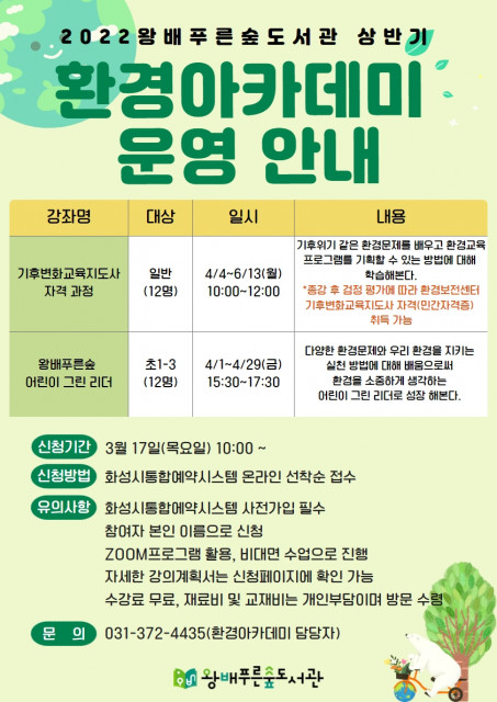 화성시 왕배푸른숲도서관, 지구를 살리는 ‘환경아카데미’ 4월부터 운영