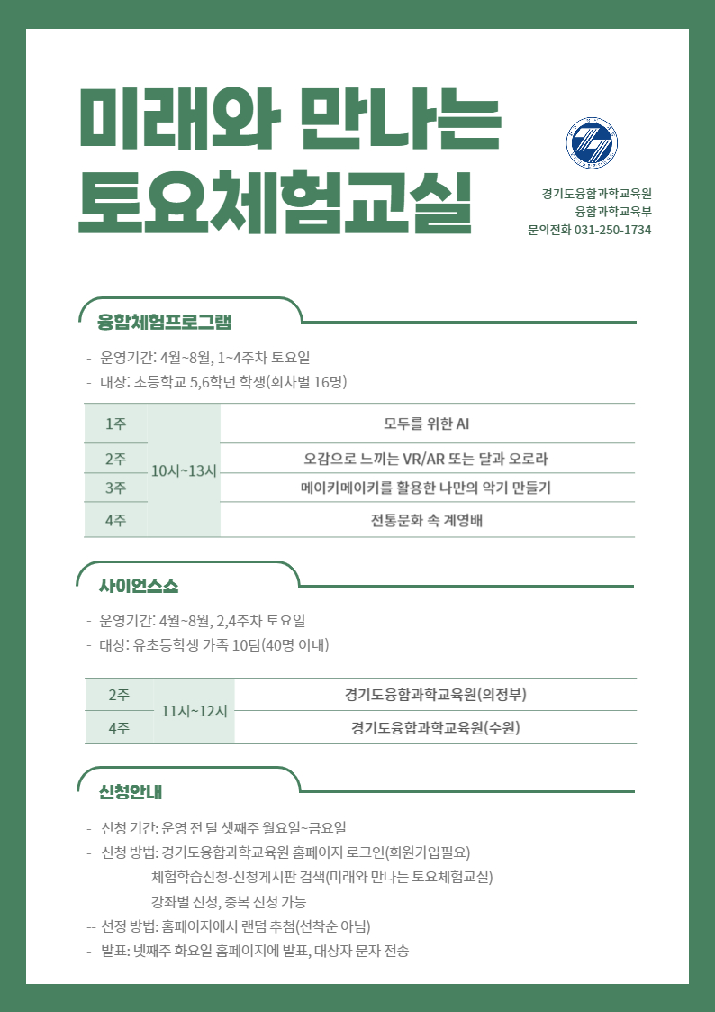 경기도융합과학교육원, '미래와 만나는 토요체험교실' 참가 학생 모집
