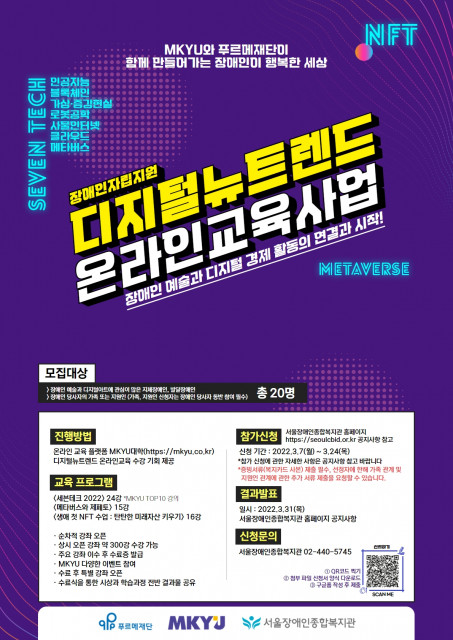 지난 3월 14일(월), 서울장애인종합복지관(관장 곽재복)이 온라인 지식 플랫폼 MKYU, 푸르메재단과 함께 ‘장애인자립지원 디지털뉴트렌드 온라인교육사업’ 참가자를 모집한다고 밝혔다. 이번에 교육은 메타버스, NFT 등의 개념 및 기술을 디지털 아트에 접목하는 교육을 진행함으로써 장애인 예술 분야의 NFT로의 확장과 함께 장애인 일자리 창출 및 자립 가능성을 모색하기 위해 진행된다. 또한 접수 마감은 3월 24일(목)까지이며 장애인 예술과 디지털 아트에 관심이 많은 지체장애인, 발달장애인, 장애 당사자의 가족 또는 지원인 총 20명을 선정할 예정이다.