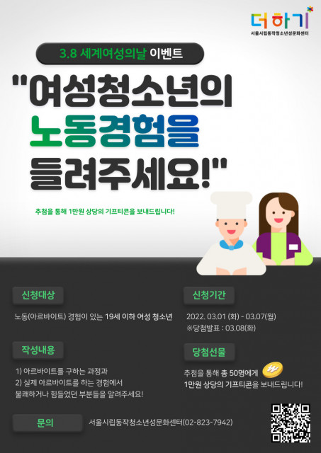 서울시립동작청소년성문화센터는 지난 2월 28일(월)부터 3월 7일(월)까지 세계 여성의 날을 맞아 ‘여성청소년들의 노동경험을 들려주세요!’ 캠페인을 진행한다고 밝혔다. 2014년 서울시여성가족재단 연구 결과에 따르면 성별에 따라 접근할 수 있는 일자리가 다르고, 여성청소년들에게 가장 필요한 아르바이트 정책은 ‘건전한 일자리 제공(45%)’으로 조사됐다.