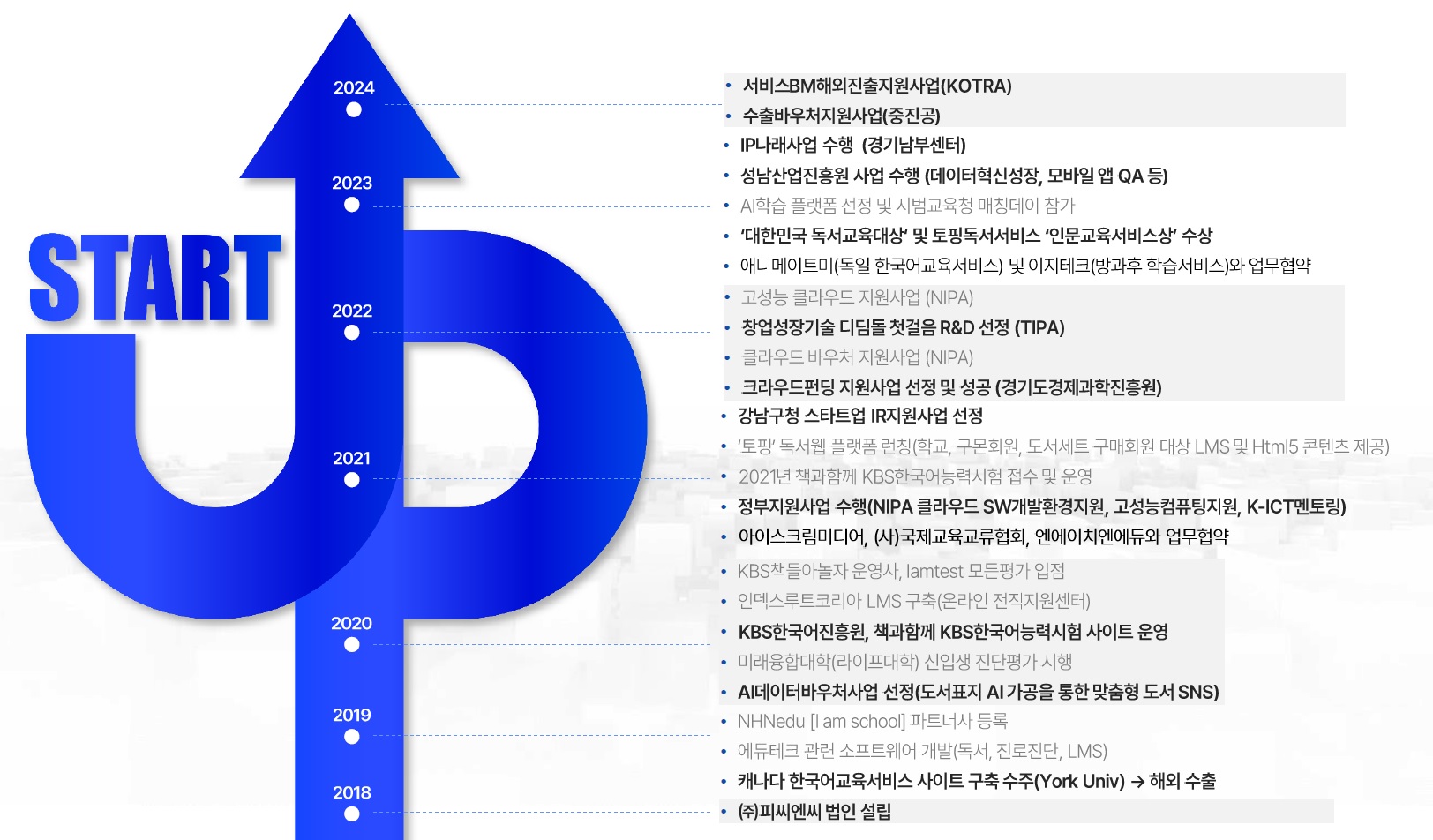 ㈜피씨엔씨는 2018년도에 설립된 에듀테크 기업으로 AI 기반의 웹·모바일 통합독서지원서비스를 제공합니다.